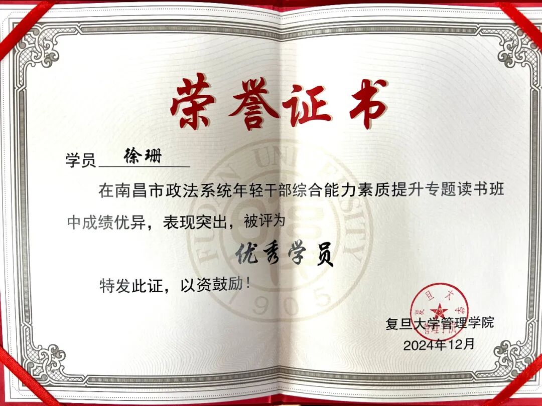 为切实加强对年轻政法干部的培养力度,南昌市委政法委联合复旦大学组建了南昌市政法系统年轻干部综合能力素质提升专题读书班,利用周末时间,开展了为期18个月的线下集中学习。通过对11门课程的学习,综合日常考勤、作业完成和测验分数等情况,我院分党组成员、政治部主任黄雨晨、办公室主任徐珊被评为“优秀学员”并予以通报表扬!