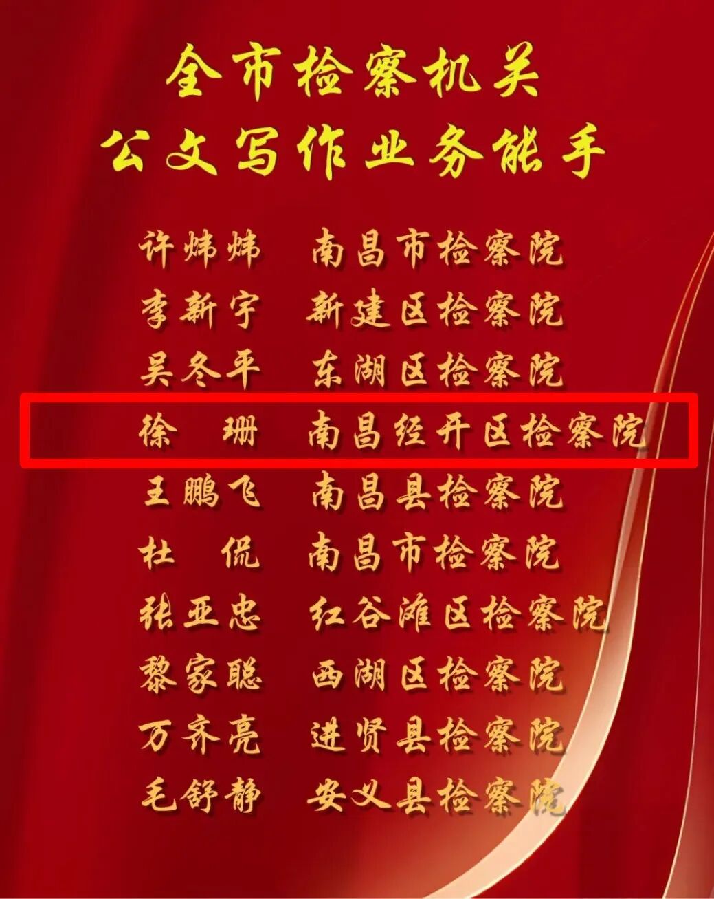 8月14日下午,南昌市检察院举办“全市检察机关公文写作宣传舆论业务竞赛”颁奖仪式。全市两级院参加公文写作宣传舆论业务竞赛的选手,基层院代表,市院各部门从事公文写作宣传舆论业务的干警参加颁奖仪式。我院徐珊同志荣获“全市检察机关公文写作业务能手”称号。