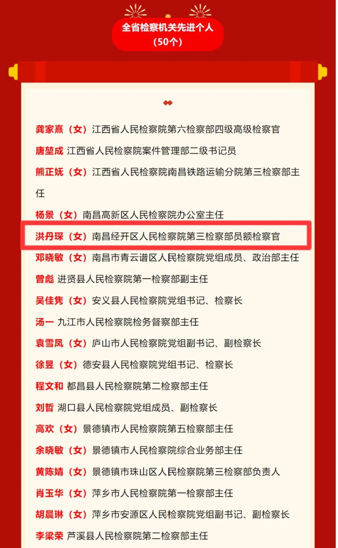 为进一步弘扬英模精神,激励全省检察机关和全体检察人员不忘初心、牢记使命、踔厉奋发、勇毅前行,努力开创新时代江西检察事业新局面,经省委、省政府批准,江西省人民检察院开展了全省检察机关首届先进集体先进个人评选表彰活动。近日,江西省人民检察院印发《关于表彰全省检察机关首届先进集体先进个人的决定》,其中,南昌经开区人民检察院第三检察部员额检察官洪丹琛同志被评为“全省检察机关先进个人”!