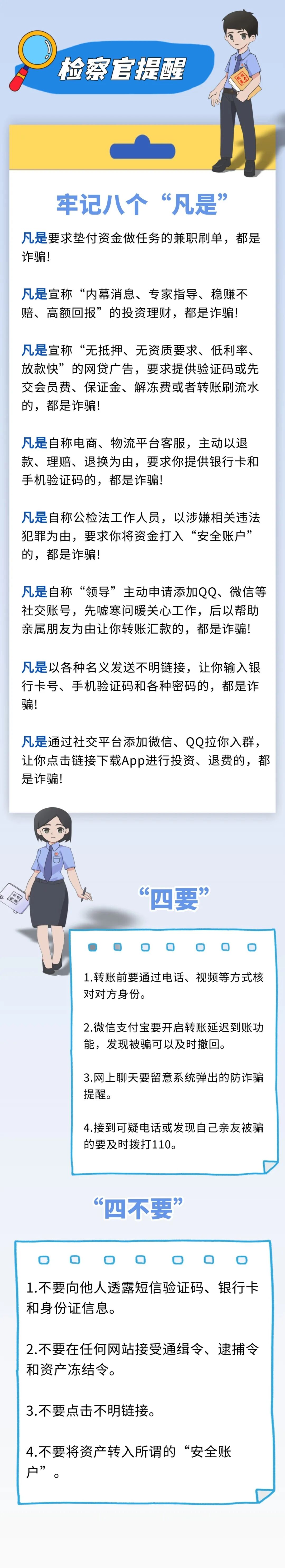 该法通过三周年,为切实保障广大群众财产安全,严厉打击电信诈骗犯罪,让我们共同提高识骗防骗能力,谨防上当受骗。请您认真阅读学习以下相关内容,在生活中擦亮眼睛,谨防诈骗!