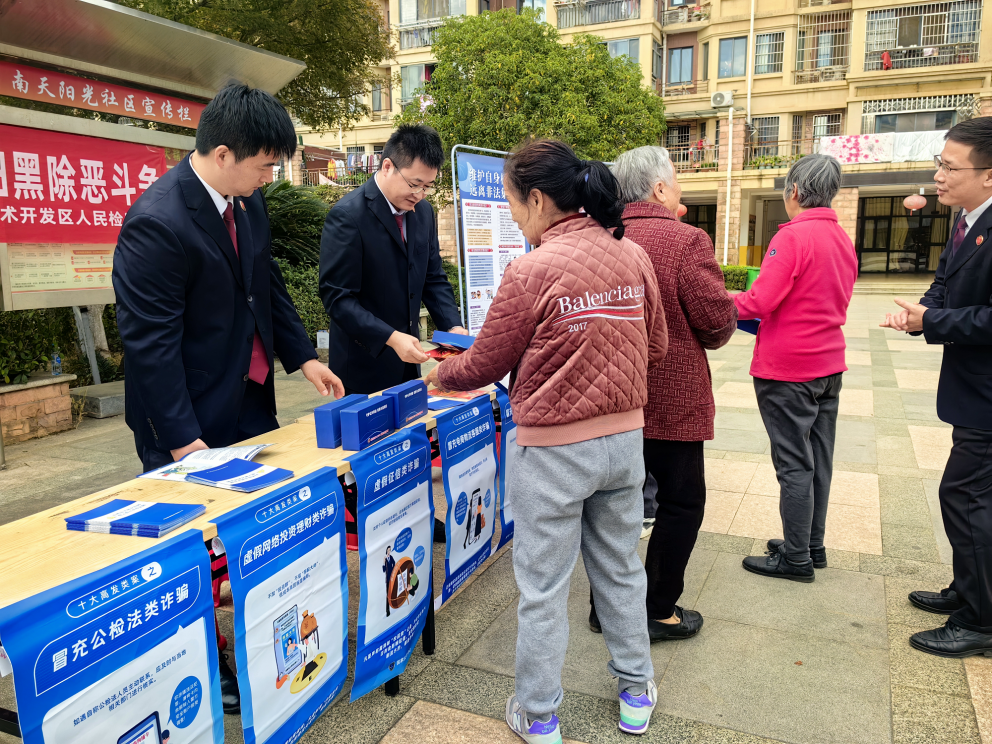 为进一步提升社区居民的法律意识和风险防范能力,切实保障群众财产安全,近日,南昌经济技术开发区人民检察院联合南天阳光社区工作人员,在社区内开展了一场内容丰富、形式多样的普法教育宣传活动,将法律知识送到居民“家门口”。