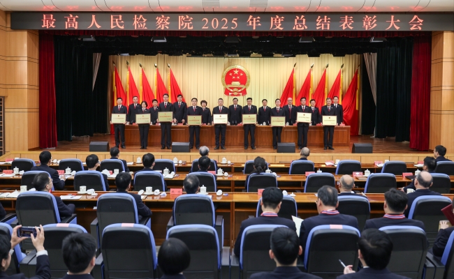 2月12日,最高人民检察院举行2025年度总结表彰大会,回顾过去一年工作,表彰表扬机关优秀部门和先进个人,展望新一年工作。最高检党组书记、检察长应勇出席会议并讲话。最高检党组副书记、常务副检察长童建明主持会议,党组成员、副检察长葛晓燕宣读最高检从检30年检察荣誉章获得者名单,党组成员、政治部主任滕继国宣读最高检2025年度考核表彰决定。出席会议的最高检领导、检委会专职委员为检察荣誉章获得者和优秀部门、立功及考核优秀个人代表颁奖。